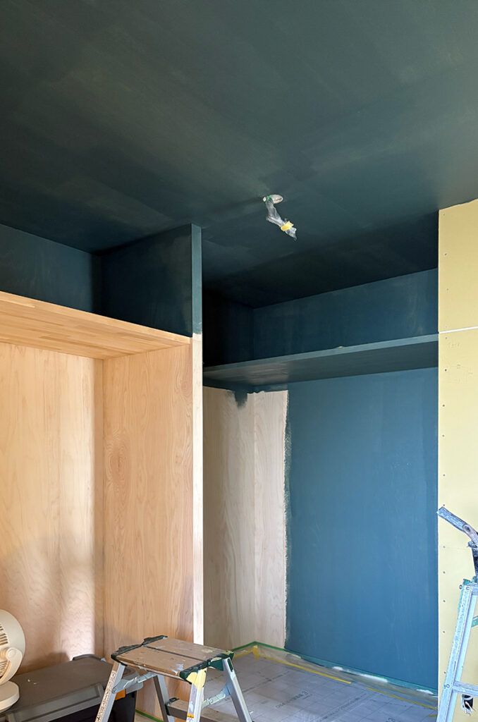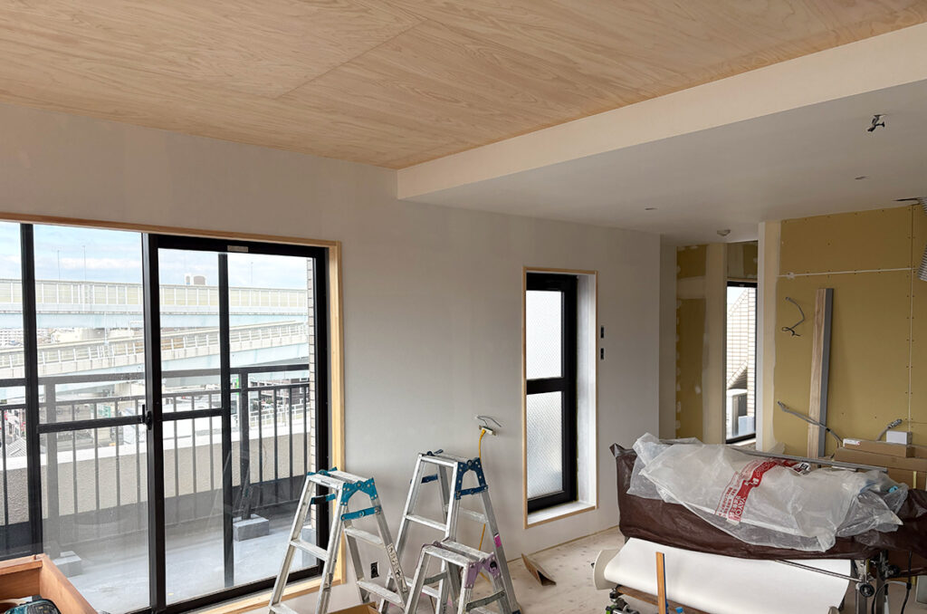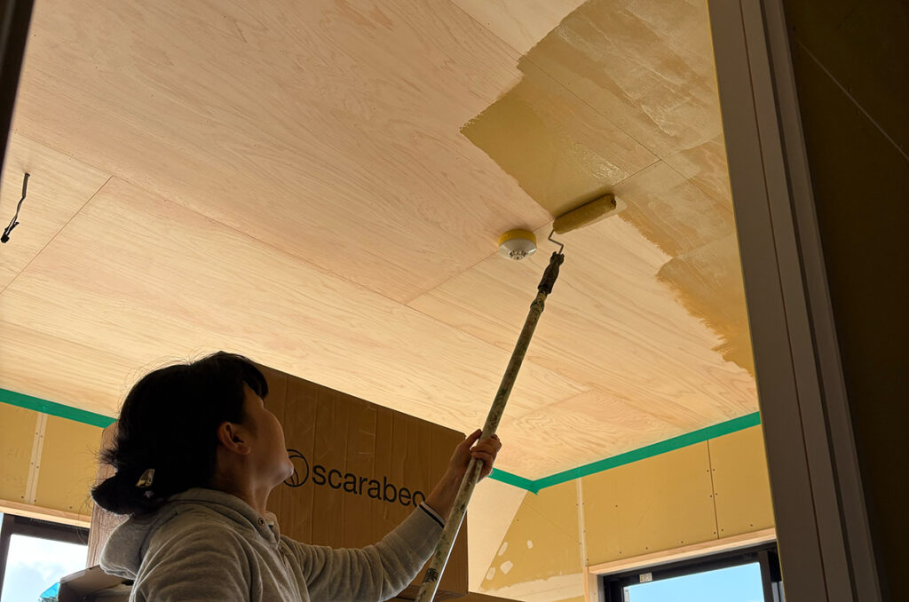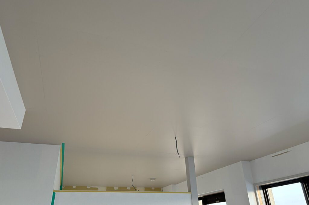 職人さんにクロスを貼って頂きつつ、他の部屋の天井をペイントしていきます。