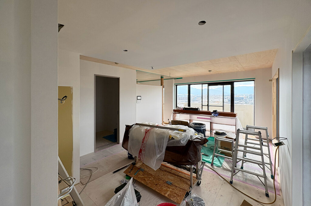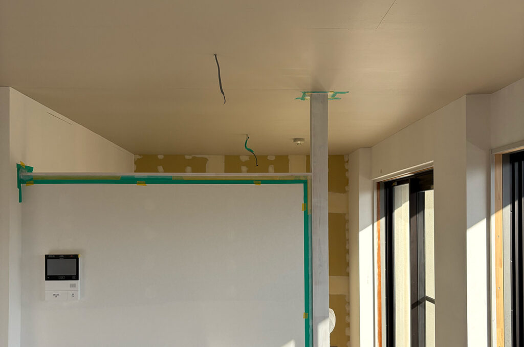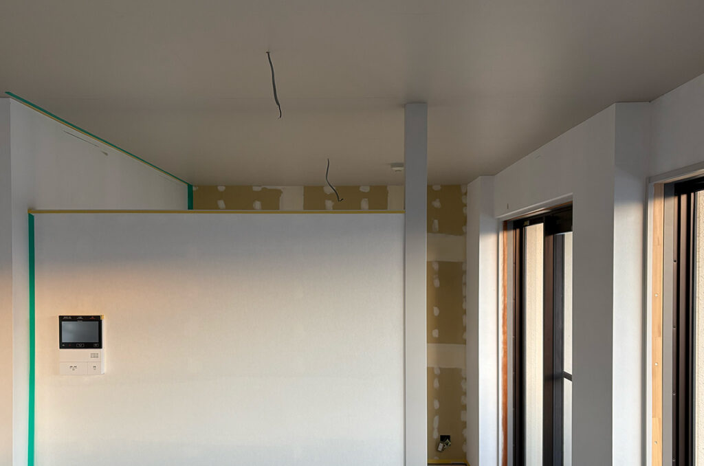 天井・壁に断熱材が入り、工事がある程度進んだところで、